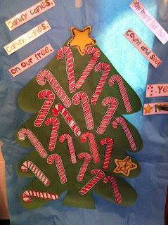 On Wednesday morning they were excited to come in and not do their typical welcome work!! They got to color a candy cane if they liked them and decorate a star if they didn't. I think the tree turned out beautiful. You can't see it in the picture, but we counted to find out that 21 children like candy canes and 2 do not. :)