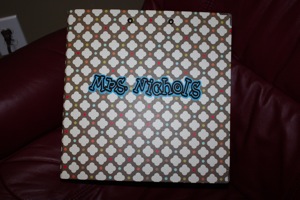 One of the many items on my never ending to do list is to give my assessment notebook a make-over. I actually have 2 right now - one for class records and one for individual records - only because my really cute one I bought at the beginning of the year is not big enough for everything. :( So - today while I was making one of my many trips to Target :) I found a NEW notebook that I just couldn't pass up!! And it is BIG! 2 inches!! It doesn't take a lot to excite me! :) I could't polka dot it anymore so I just added my name - I couldn't decide what else I wanted to put on it so my name is gonna have to do for now. :)
