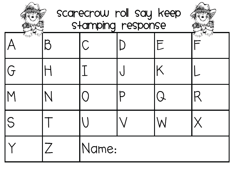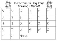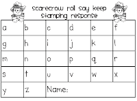 I made these to go along with Kim's Alphabet Scarecrow Roll Say Keep game I showed above. I have been trying to find a way to introduce stamps to my babies and thought this would be a perfect way. Depending on the level I have in my group, they can stamp the matching letter the member of our group rolled, or they can stamp the opposite (capital or lowercase) letter that was rolled by a group member. I can also put this in a center next week and they "should" be able to do this independently!!