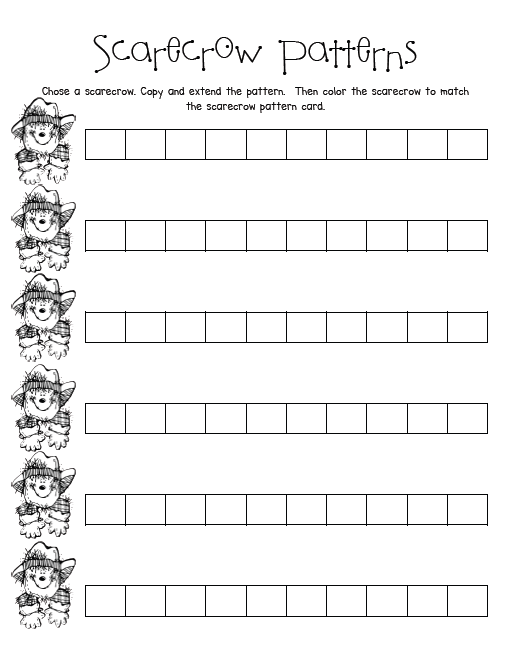 I made this color coded patterning activity for a math tub! You should know the drill by now - Run the scarecrow on 6 different colors. Cut and glue the pattern starters to the back of each scarecrow. Laminate and you are good to go!! I had a spider one, and a bat one like this but of course I didn't have a Scarecrow one - sooooo I made one!! :)